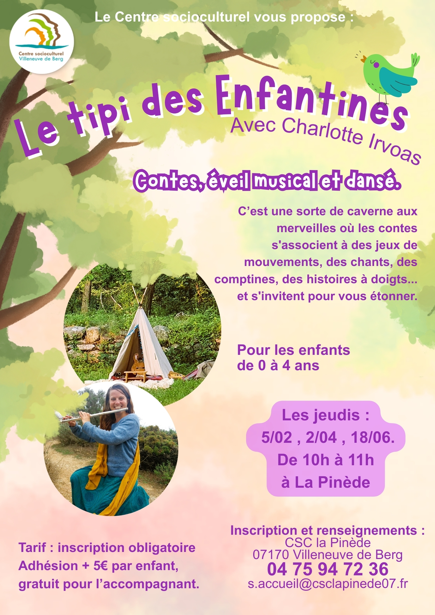 Eveil musical pour les tout petits, Avec Charlotte. Le jeudi 18 décembre, 0-4 ans : 10h-11h 5-12 ans : 17h30-18h45 5€ par enfant (6€ hors comcom) Gratuit pour l'accompagnant.